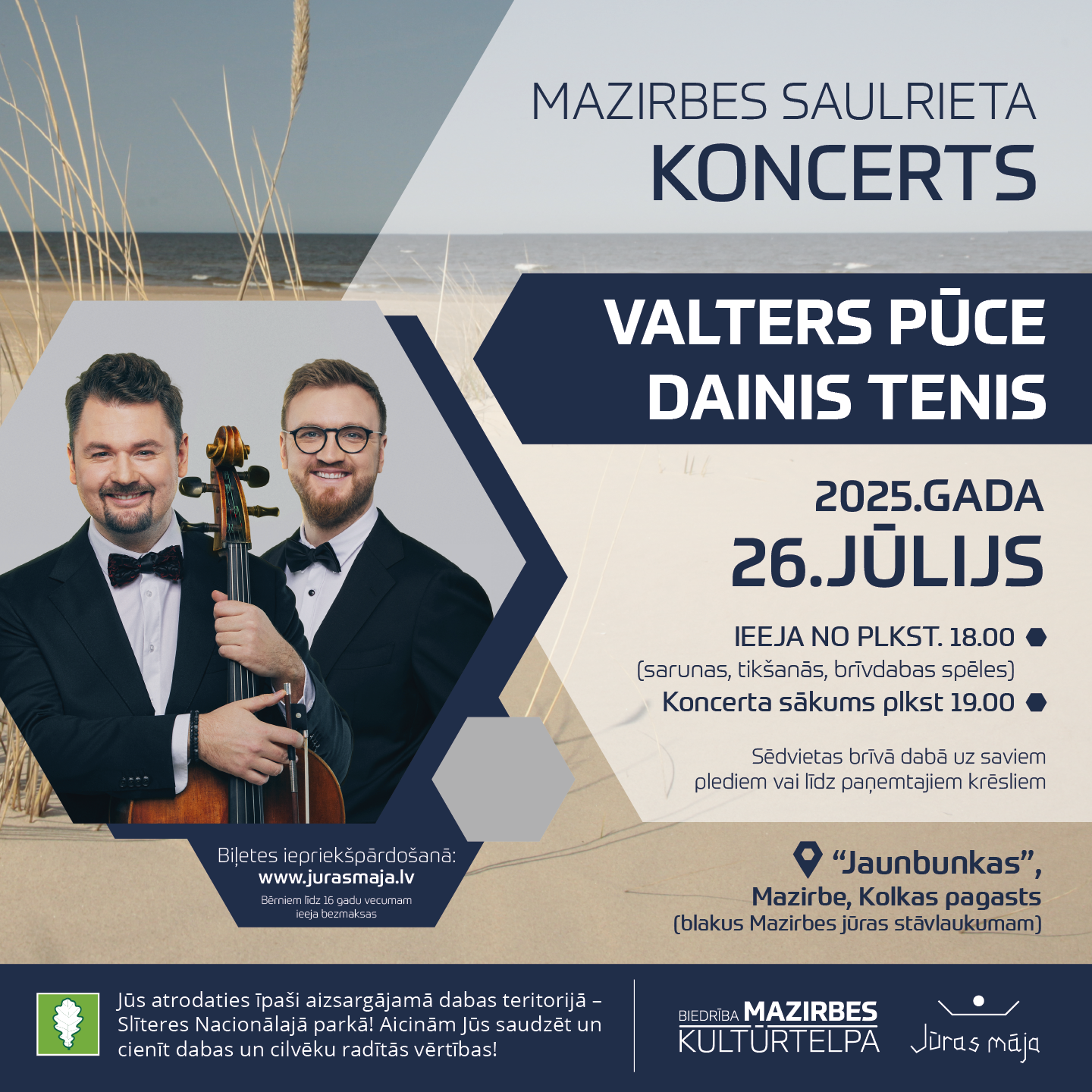 Programma ietver katras desmitgades spilgtāko dziesmu, piedāvājot klausītājiem aizraujošu ceļojumu cauri 100 gadiem populārajā mūzikā – Maikla Džeksona, Adeles, kā arī leģendāro rokgrupu “Queen”, “The Beatles”, “Nirvana” un citu ikonisku mūziķu dziesmas. Mazirbes Saulrieta koncertā skanēs ne tikai “Pop Goes Classical”, bet arī klausītāju iemīļotie skaņdarbi no programmām “Radīts Latvijā” un “Bez elektrības!”.Valters Pūce un Dainis Tenis, izmantojot izsmalcināti meistarīgo izpildījumu, kā arī savu akadēmisko un grupā “Dagamba” gūto pieredzi, iedvesmo mūzikas cienītājus izbaudīt pazīstamas melodijas no pavisam jauna skatpunkta.