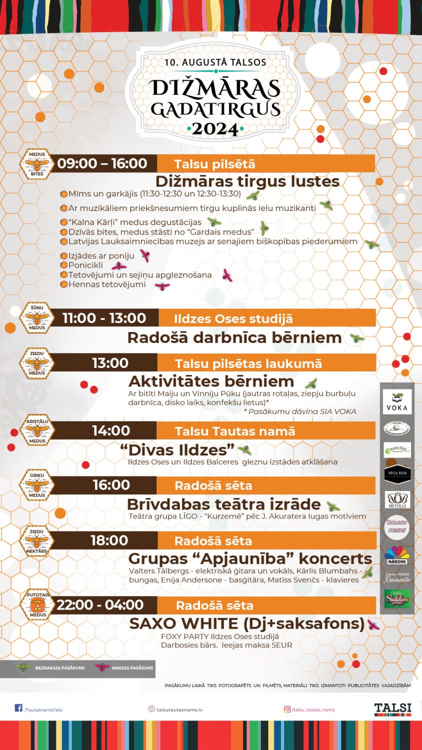 Kā jau kārtīgā tirgū, būs dažādi pārsteigumi. Tev būs iespēja satikt Mīmu un Garkāji, baudīt priekšnesumus un dziedāt līdzi dažādiem ielu muzikantiem, baudīt īstu medus garšu un medus stāstus, kā arī Latvijas Lauksaimniecības muzejs dos iespēju iepazīt senos biškopības piederumus.