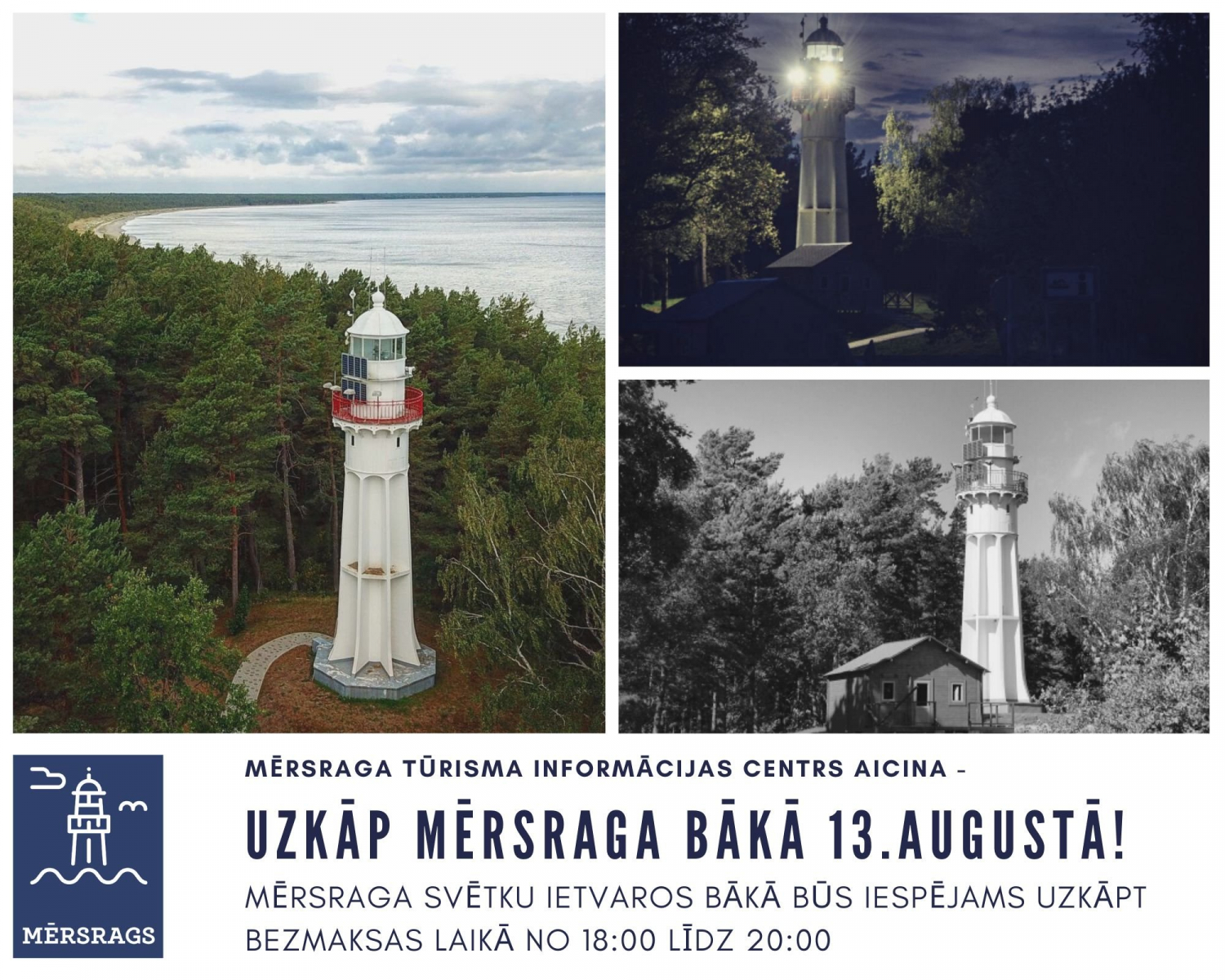 13. augustā Mērsraga svētku ietvaros, laikā no 18.00 – 20.00, iespēja bez maksas uzkāpt Mērsraga bākā.