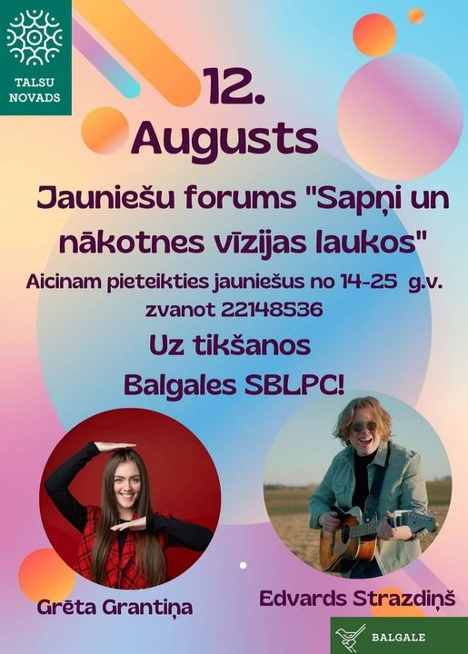 12. augustā Balgales Blpc jauniešu forums, kurā diskutēsim par iespējām laukos, par nākotnes vīzijām, par to kā īstenot sapņus un kā to dara Grēta Grantiņa un Edvards Strazdiņš.