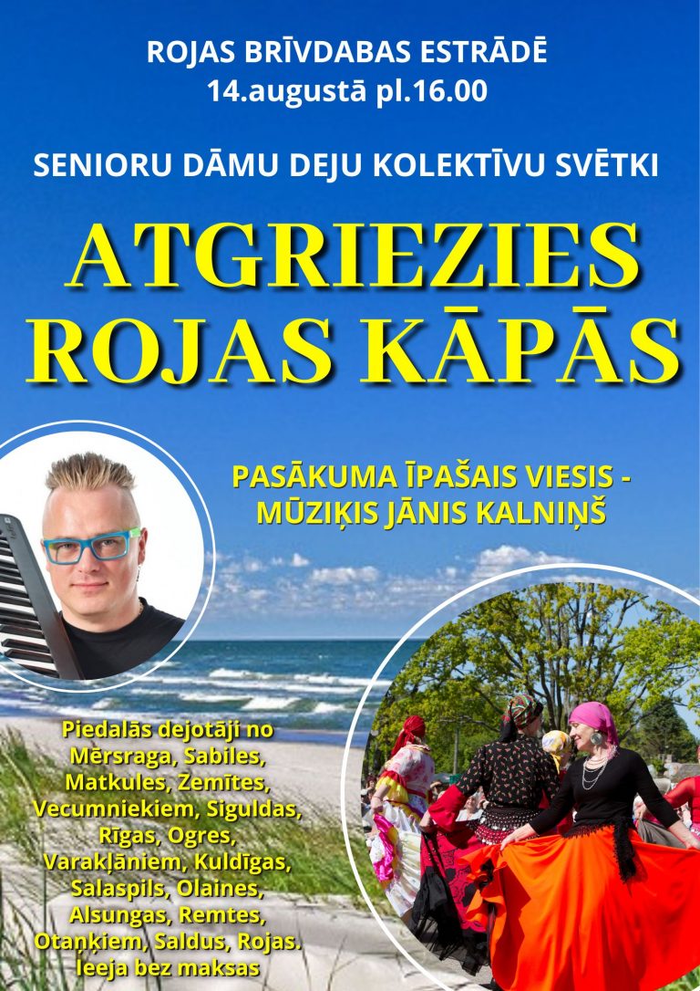 14. augustā plkst. 16.00 Rojas brīvdabas estrādē senioru deju kolektīvu svētki “Atgriezties Rojas kāpās”.