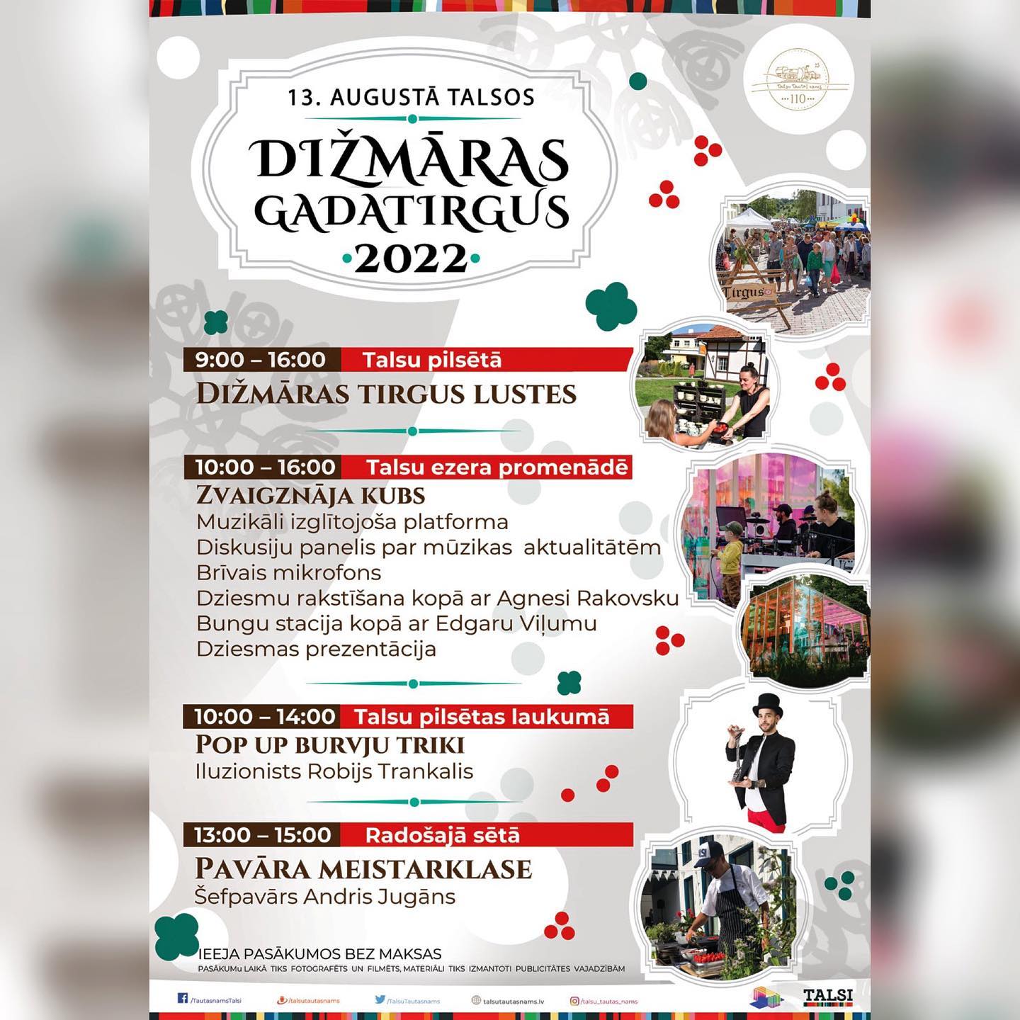 13. augustā Talsos būs “Dižmāras gadatirgus 2022”! Visas dienas garumā, no 9:00-16:00, nāc meklēt labumus tirdziņā, vairāk kā 200 tirgotāju piedāvājumā!
