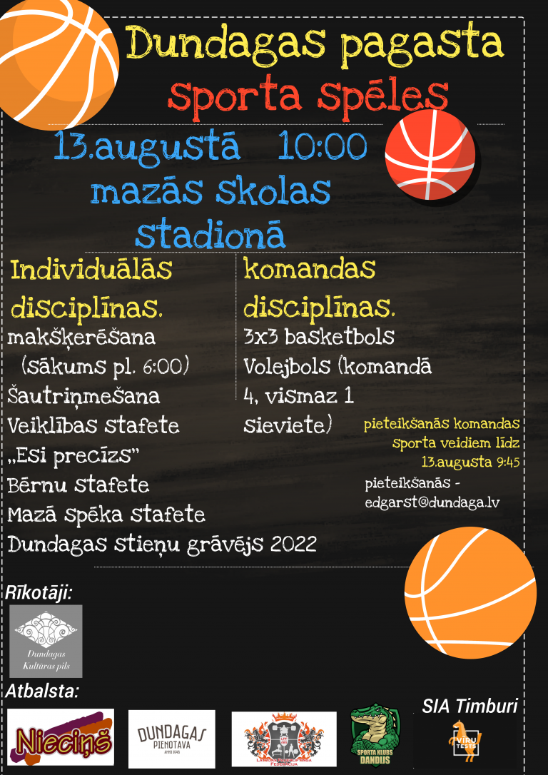 13. augustā plkst. 10.00 norisināsies ikgadējās Dundagas pagasta sporta spēles, kuras aicinās ikvienu sportot gribētāju, mazās skolas stadionā, piedalīties sportiskās aktivitātēs.
