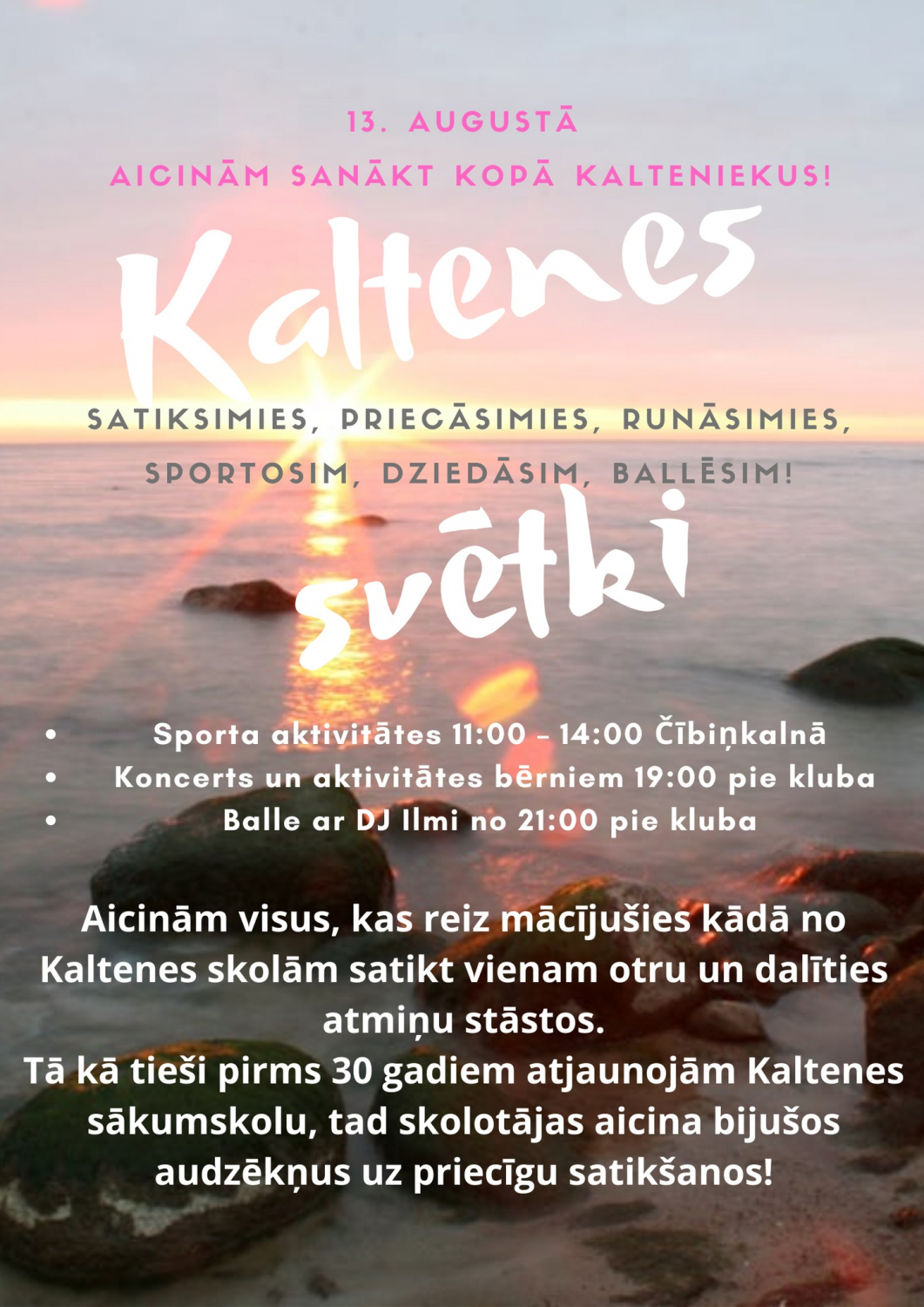 13. augustā Kaltenes svētki. Sporta aktivitātes, koncerts un pasākumi bērniem, kā arī balle ar DJ Ilmi.