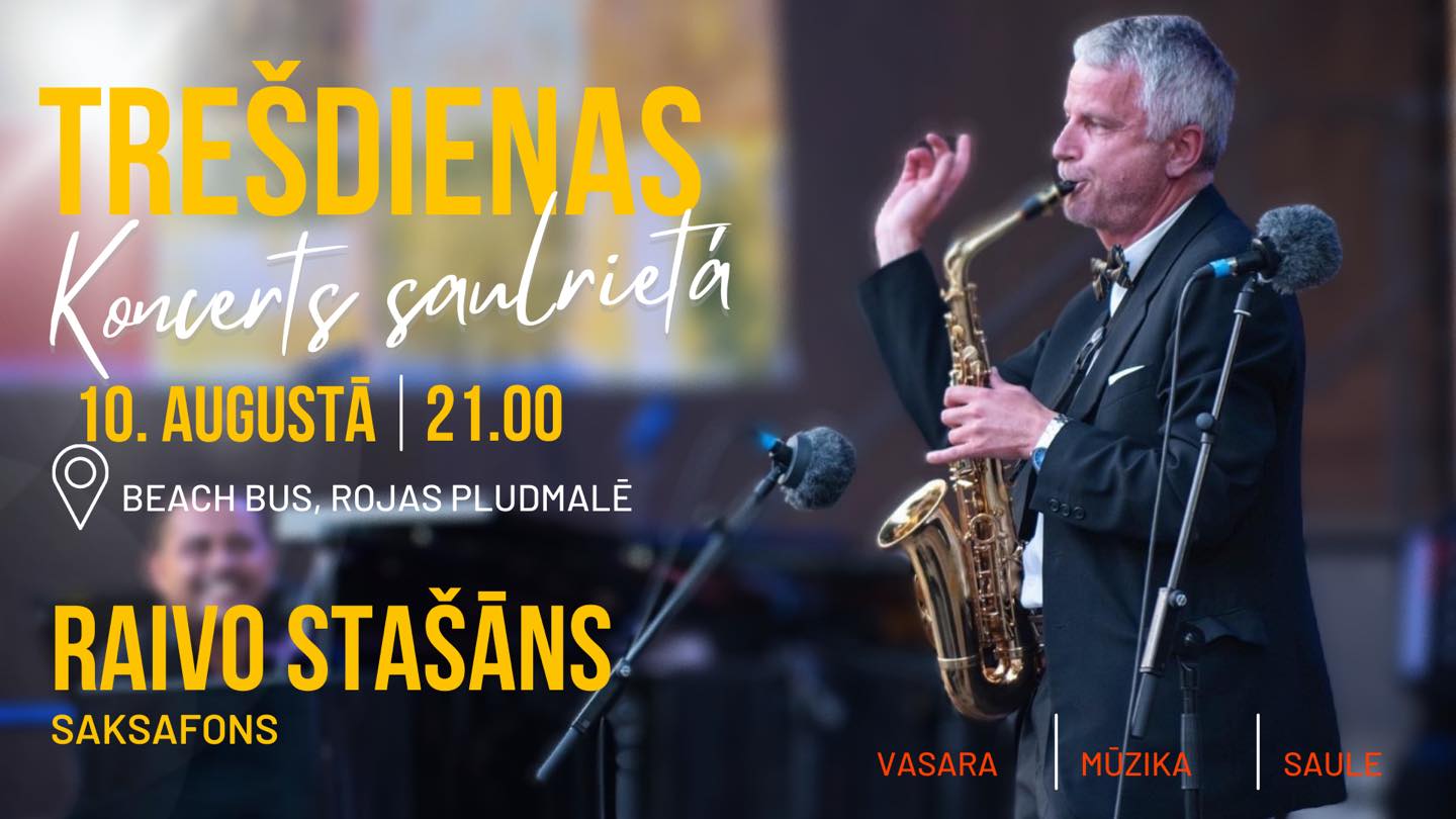 10. augustā plkst. 21.00 koncerts saulrietā kopā ar saksofonistu Raivo Stašānu Rojas pludmalē.