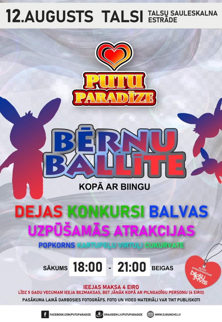 Vasaras piedzīvojums „Putu Paradīzes” bērnu ballītē 12. augustā plkst. 18.00 Talsos Sauleskalna estrādē.