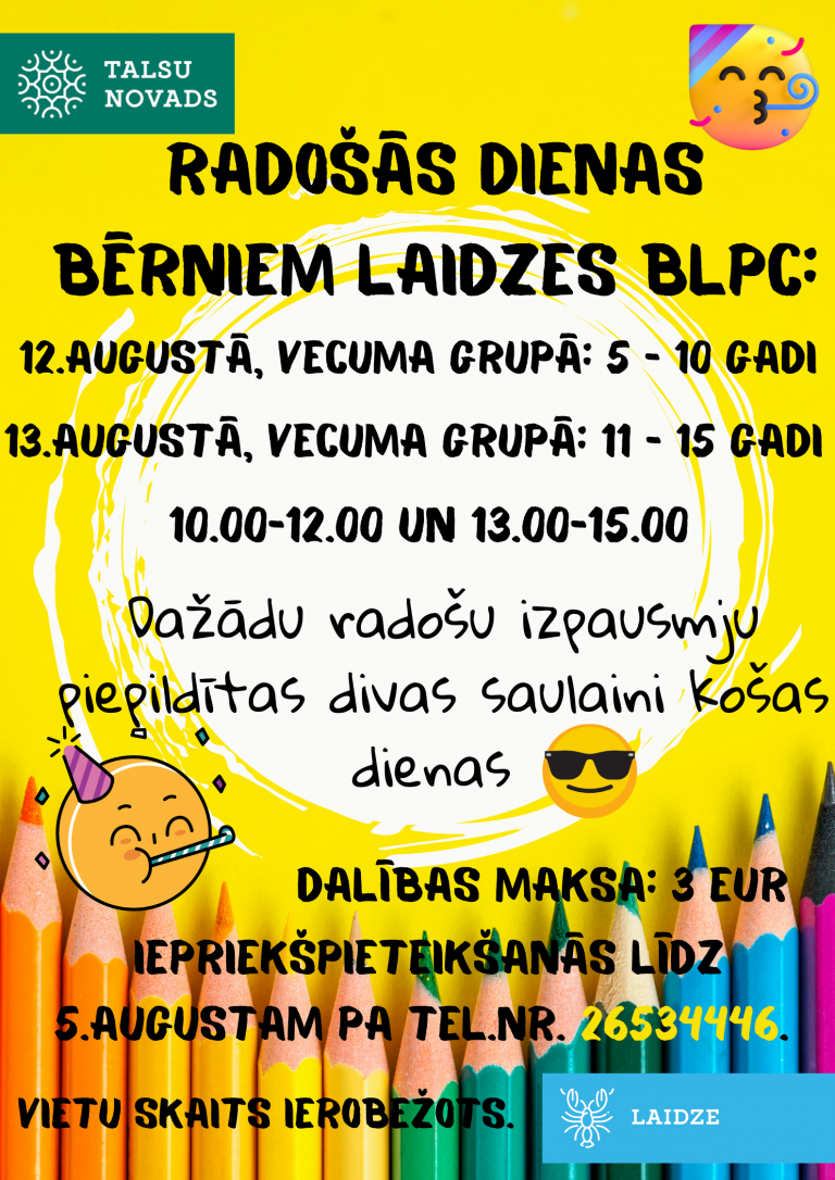 No 12. – 13. augustam Laidzes BLPC Radošās dienas bērniem. Jūs sagaida dažādu radošu izpausmju piepildītas divas dienas.