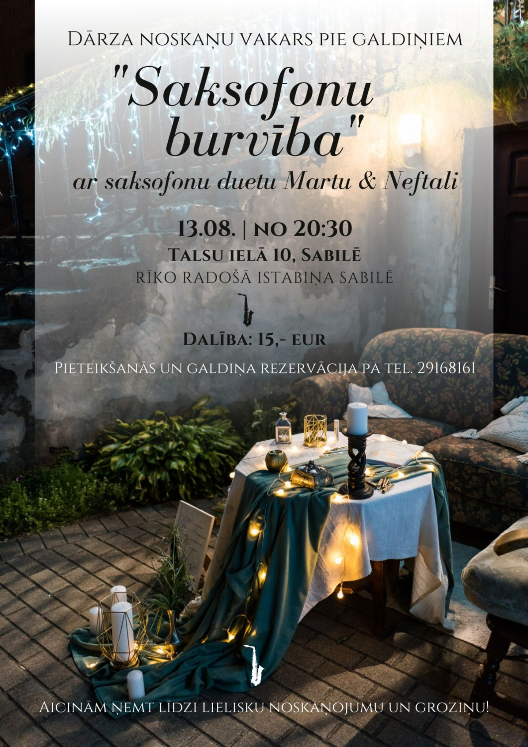 13. augustā plkst. 20.30 radošajā istabiņā Sabilē dārza noskaņu vakars pie galdiņiem “Saksofonu burvība”.