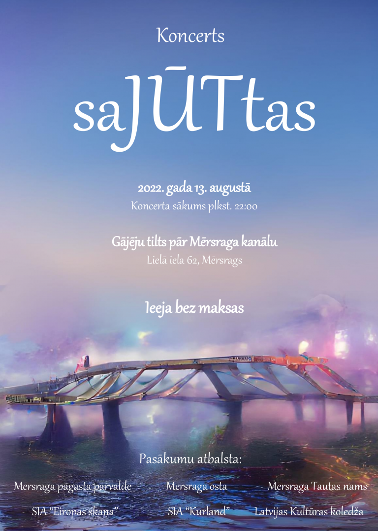 Atzīmējot Mērsraga pagasta svētkus un Mērsraga kanāla 180. gadadienu, sestdien, 13. augustā, pulksten 22.00 uz gājēju tilta Mērsraga ostas teritorijā būs skatāms koncerts „saJŪTtas”.