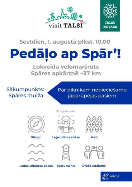 Sestdien 1. augustā plkst. 10:00 norisināsies sestais tūrisma akcijas “Pēdo un pedāļo” Talsu novadā pasākums – “Pedāļo ap Spār’!”. Pasākuma laikā dosimies aptuveni 37 km garā velobraucienā pa Spāres apkārtni.