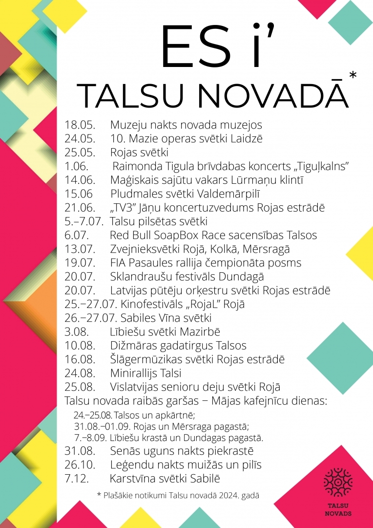 Tie nebūt nav visi lielākie pasākumi novadā, ieskaties afišā un seko līdzi kultūras un sporta notikumu dzīvei, www.talsunovads.lv, Visit Talsi un citos Talsu novada Tūrisma informācijas centros.