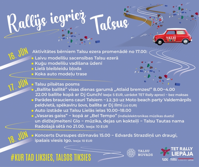 Būtiskāki satiksmes ierobežojumi gaidāmi 17. jūnijā no 12.30 līdz 18.00, kad Talsu pilsētā satiksmei tiks slēgta Gravas iela (visā tās garumā), Ezera iela (posmā no Gravas ielas līdz Lielajai ielai), Lielā iela (posmā no Ezera ielas līdz Talsu pilsētas laukumam), Fabrikas iela (visā tās garumā), Saules iela (posmā no Fabrikas ielas līdz Jaunatnes ielai), Jaunatnes iela (visā tās garumā).