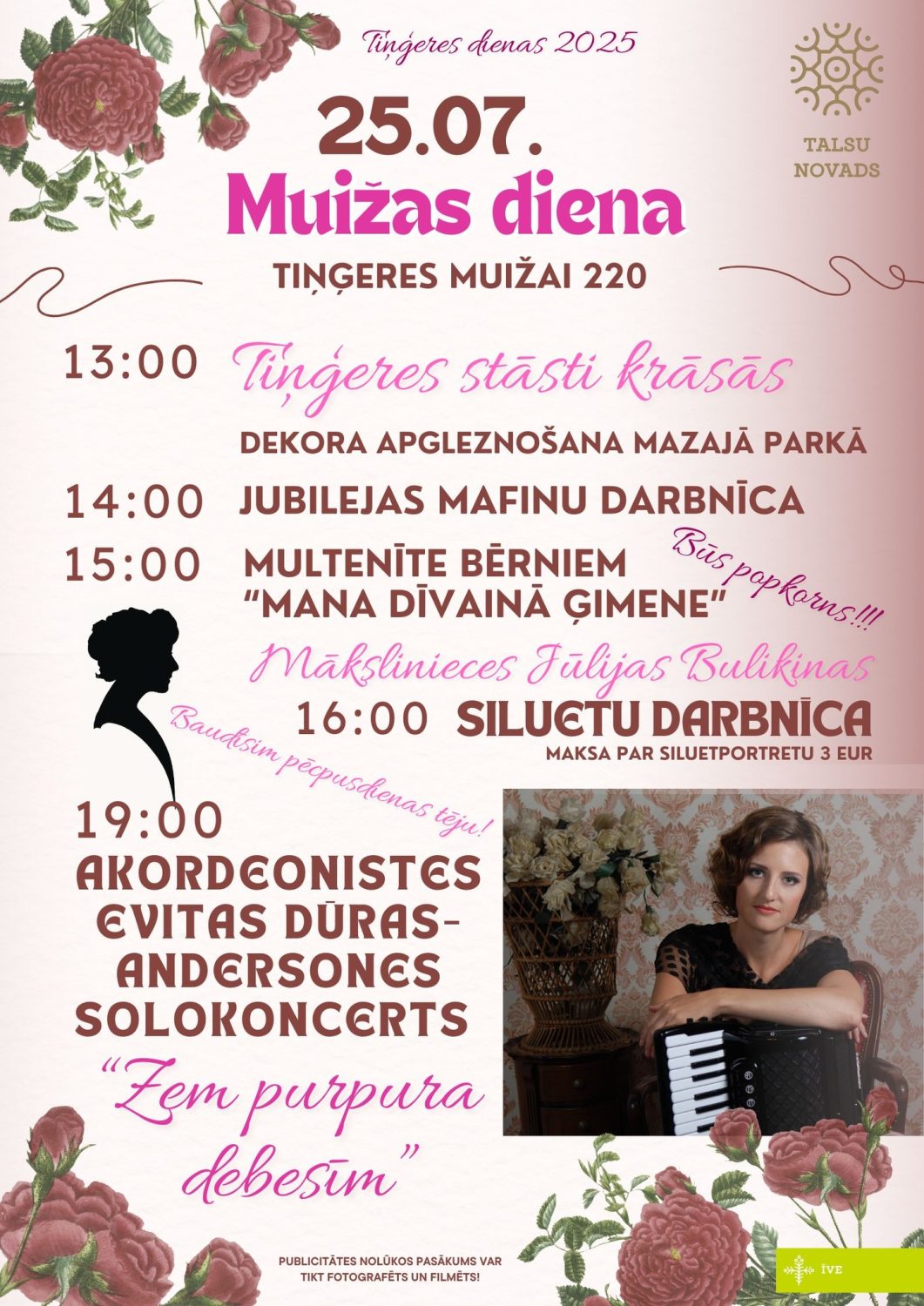 19.00 Valdemārpils apvienības pārvaldes vadītāja sveiks Īves pagasta jaundzimušos un vakars noslēgsies ar brīnišķīgu akordionistes Evitas Dūras Andersones solokoncertu “Zem purpura debesīm” un Muižas jubilejas kūkas baudīšanu!