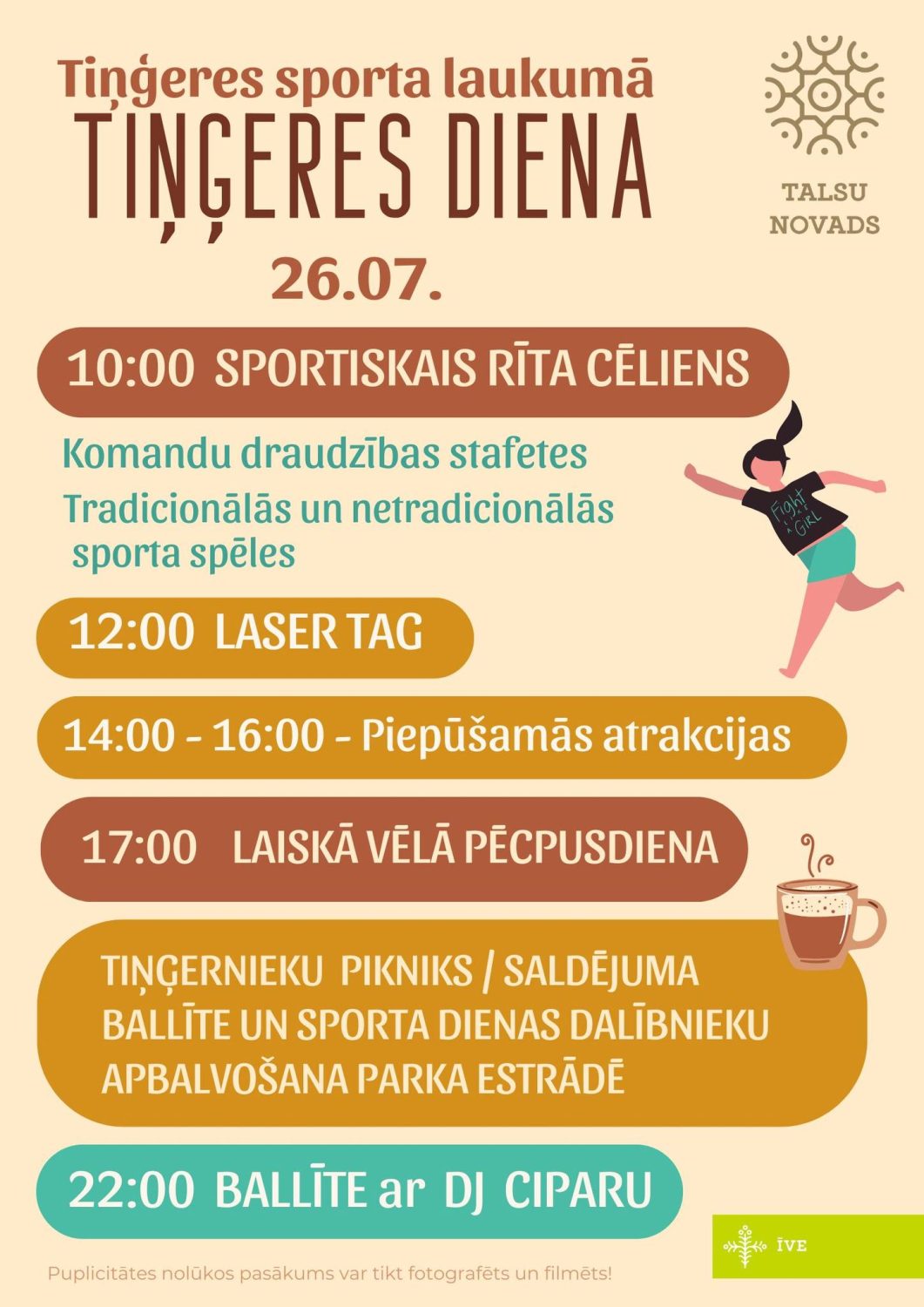 Sestdiena, 26.jūlijs veltīta sportiskām aktivitātēm, gan dažādām tradicionālām un netradicionālām sporta spēlēm, gan stafetēm, mazajiem būs iespēja sparīgi izlēkāties piepūšamajās atrakcijās, bet pārējiem aktīvi darboties LaserTag spēles laukumā. Lai mazliet atpūstos pirms vakara ballītes, kurā DJ Cipars rūpēsies par mūziku dažādām gaumēm, tiņģernieki aicināti uz pirmo tiņģernieku pikniku un saldējuma ballīti, kurā apkopoti Sporta dienas rezultāti.