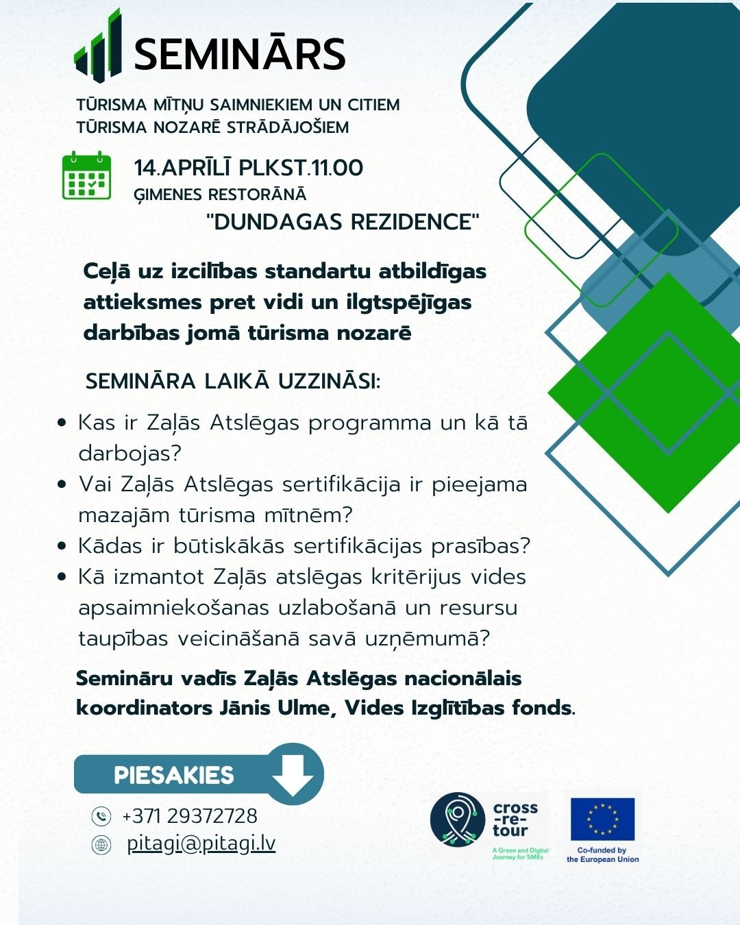 Jaunumi 05.04.2025 Zaļās Atslēgas sertifikāta seminārs Dundagā Pirmdien, 14. aprīlī plkst. 11.00 seminārs tūrisma jomas uzņēmējiem par starptautisku sertifikātu Zaļā Atslēga ģimenes restorānā “Dundagas rezidence” (Šlīteres iela 1, Dundaga). Pieteikšanās: 29372728, pitagi@pitagi.lv Related Posts Tūrisma uzņēmēji līdz 1. jūnijam aicināti pieteikties, lai iegūtu vides kvalitātes zīmi “Zaļais Sertifikāts”. Rezervē datumus Talsu novadā 2023.gadā Tiešsaistes seminārs: Efektīva komunikācija LinkedIn Apkārt pasaulei Ziemeļkurzemē Ceļoju - balsoju! 4. decembrī norisināsies seminārs “Cik eksportspējīgs ir Kurzemes tūrisms?” 4. februārī norisināsies tiešsaistes seminārs “Kā piesaistīt tūristus nesezonā, izmantojot tumsu un tumšās debesis” Mājas kafejnīcu dienas "Talsu novada raibās garšas"